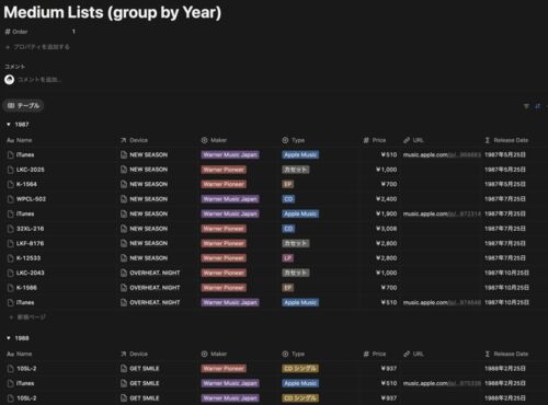 hkobの雑記録第306回では、Mediaのリストを作成し、メーカー別、タイプ別、年別にグルーピングした一覧を紹介しています。(要約 by Notion AI)