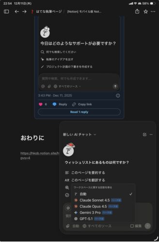 hkobの雑記録第330回では、Notionの新機能「Claude Opus 4.5」の詳細や他のモデルとの比較が紹介されています。(要約 by Notion AI)