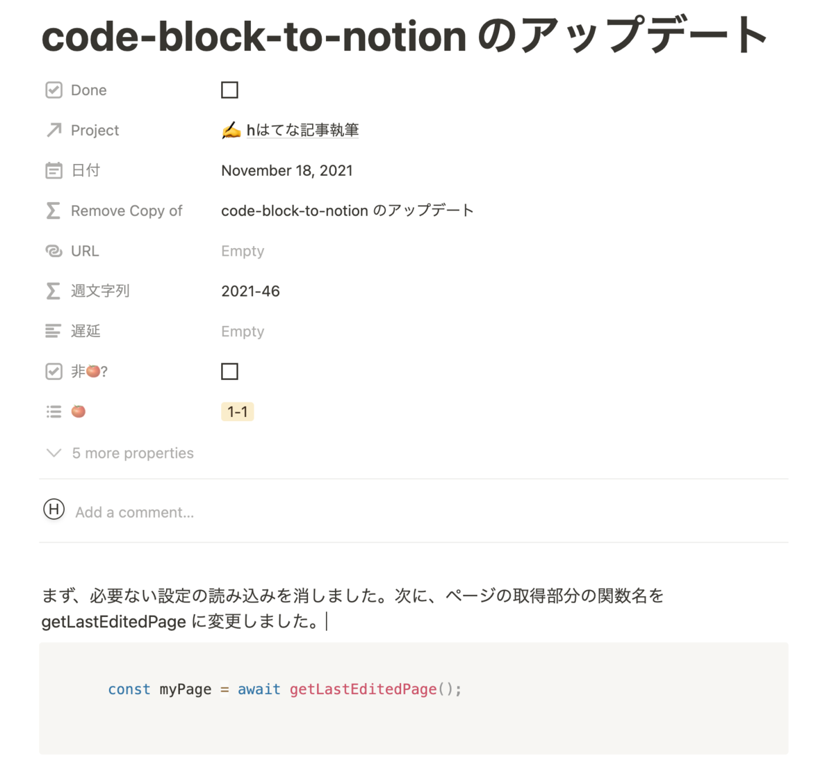 今日の「1ポモドーロ」はこの記事を書くタスクでした。Alfred から「an code-block-to-notion のアップデート」でタスクを作成しました。さらに「pn」で「1-1」ポモドーロを設定しています。この状態で、このページが一番最新のページになっているはずです。
