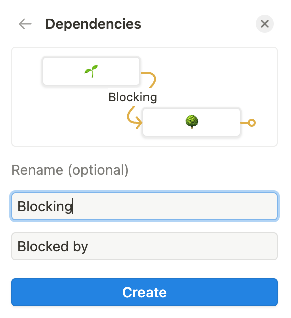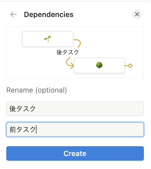まずはデータベースに依存関係を追加します。デフォルトでは「Blocking」と「Blocked by」というプロパティ名(日本語版だともっと長い名称でした)となっていますが、わかりにくいので「後タスク」と「前タスク」という名称にしました。