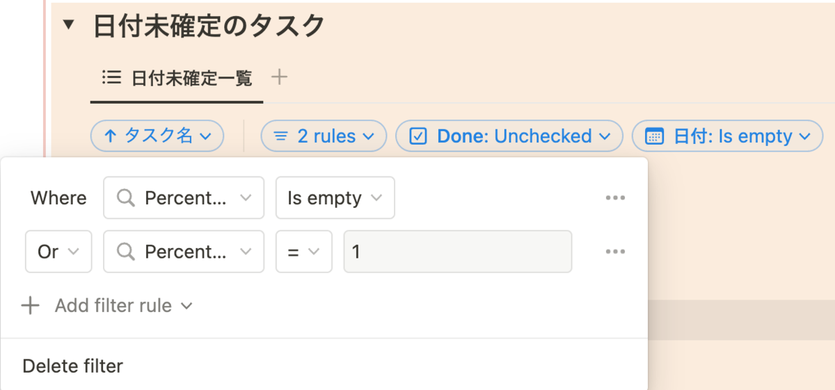 これを使って日付なしタスクのフィルタは以下のようになりました。