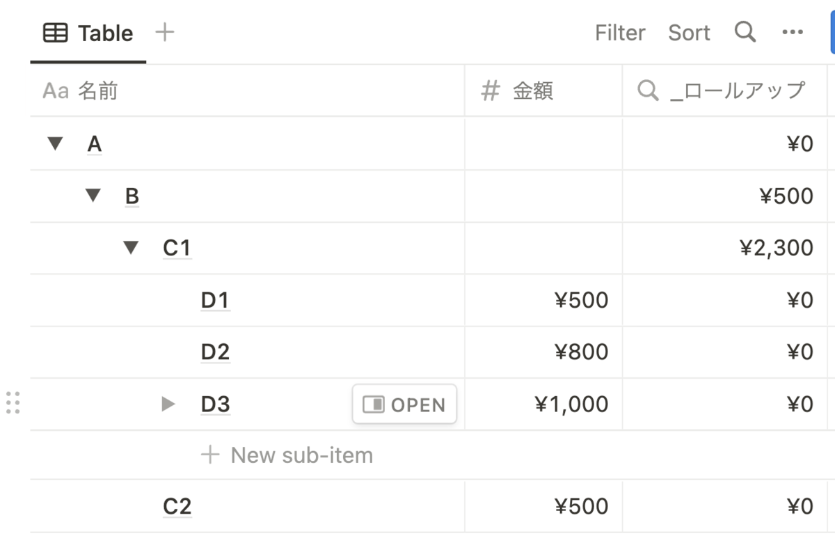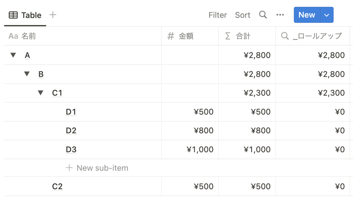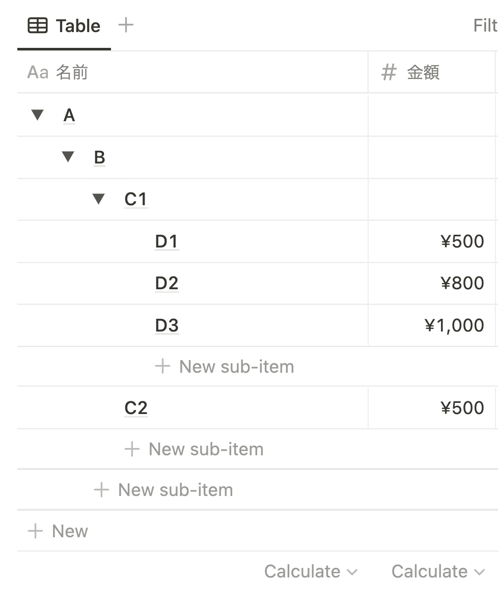 サンプルとしてこんな階層構造のものを作ってみました。A が一番上の階層、B のその下の階層になっています。B の下には C1 と C2 という二つの階層があり、さらに C1 にはさらに下の階層があるというものです。ここで、最下層のものである C2 と D1, D2, D3 には金額を入れておきます。