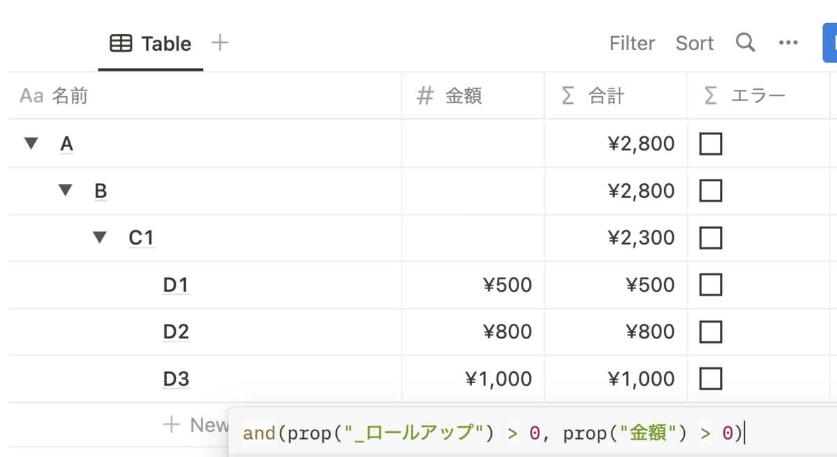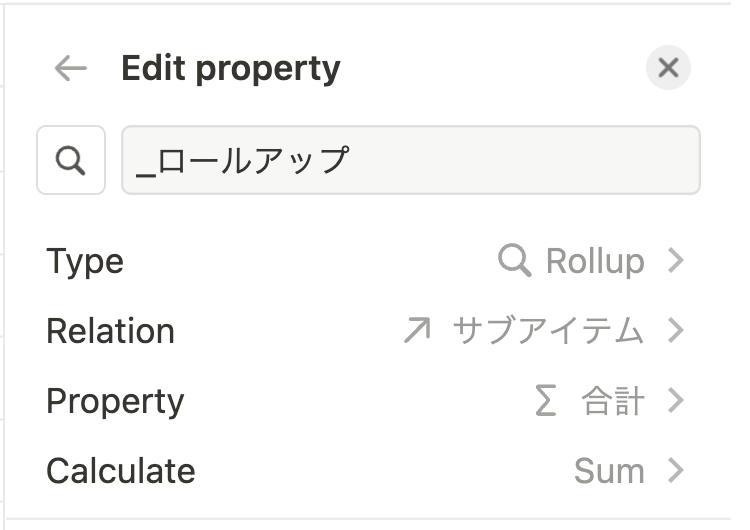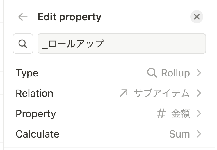 このままだと直下の金額しか集計できません。そこで、ロールアップの集計値と金額の合計を出すフォーミュラを追加します。