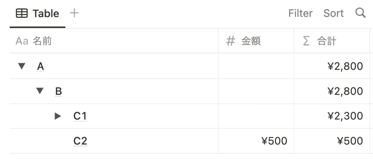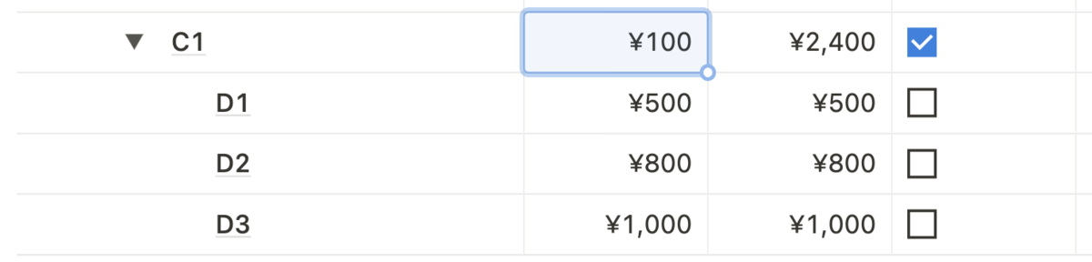 展開されているとわかりにくいですが、C1 のトグルを隠すと以下のようになります。同じ階層の金額比較ができて便利ですね。