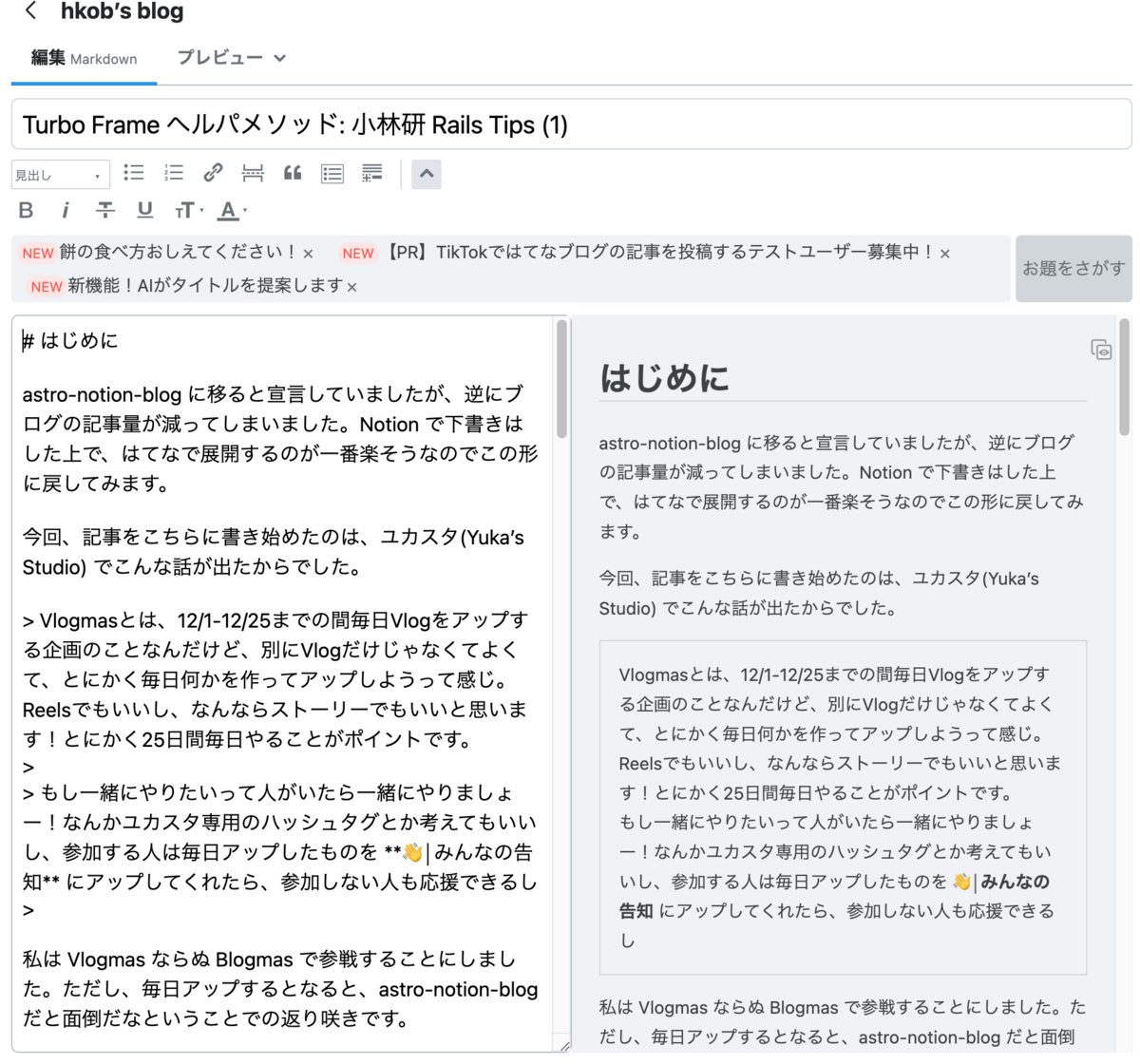 今年の頭に、はてなブログから astro-notion-blog に移行していました。Notion で記事がかけるので非常に便利だったのですが、code ブロックの折り返しや Notion ページへのリンク記述など気にしなければいけないことが多かったです。また、ビルドに時間がかかるので、ちょっと執筆のペースが落ちてしまっていました。