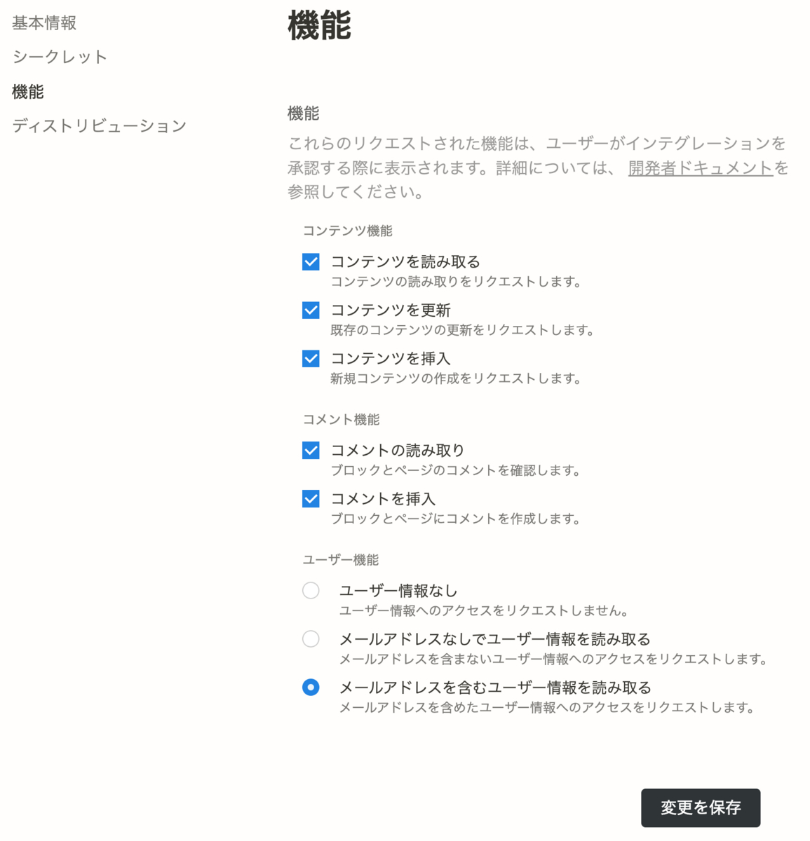 機能の選択は、作成後に左側の「機能」から設定します。今回は全ての機能をテストしてみたいので、全部にチェックをいれ、メールアドレスを含むユーザ情報を読み取ることにします。