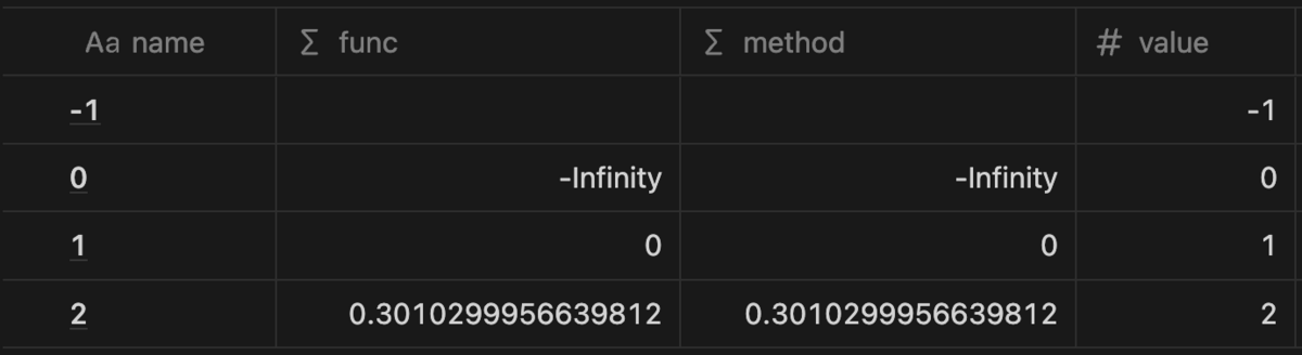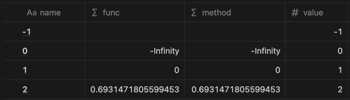 「log2」は数値の2を底とする対数を返します。負の自然対数は計算できないので Empty になります。また、0 の自然対数は-∞となります。