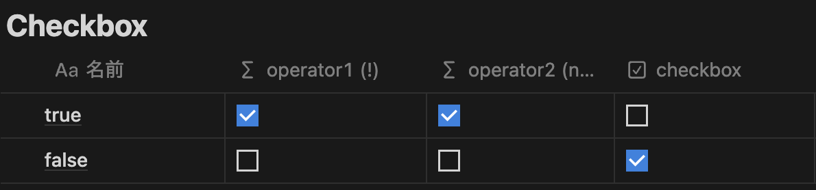 「!」はチェックボックスの値の反対を返します。チェックボックスの場合には、値が反転します。