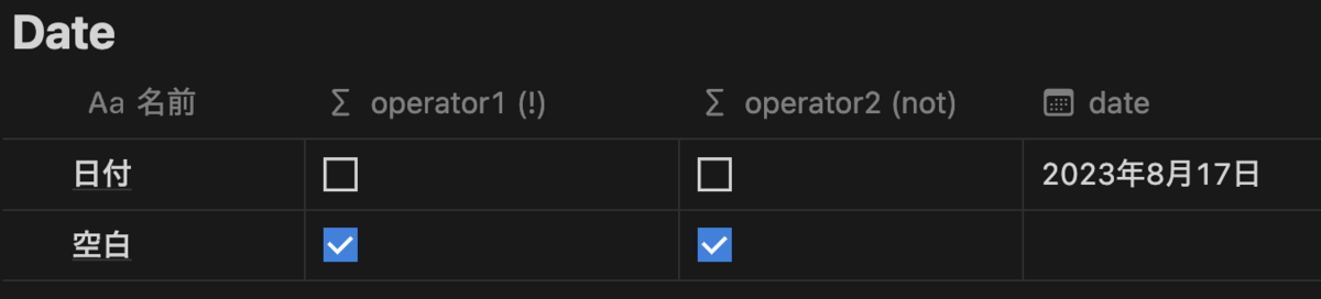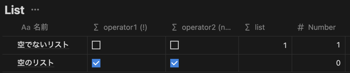 基本的には論理演算はチェックボックスに関する演算ですが、その他の型についても計算は可能です。ここでは、! でだけ確認します。文字列は空文字列だけが False になっていることがわかります(not で True に変換されています)。
