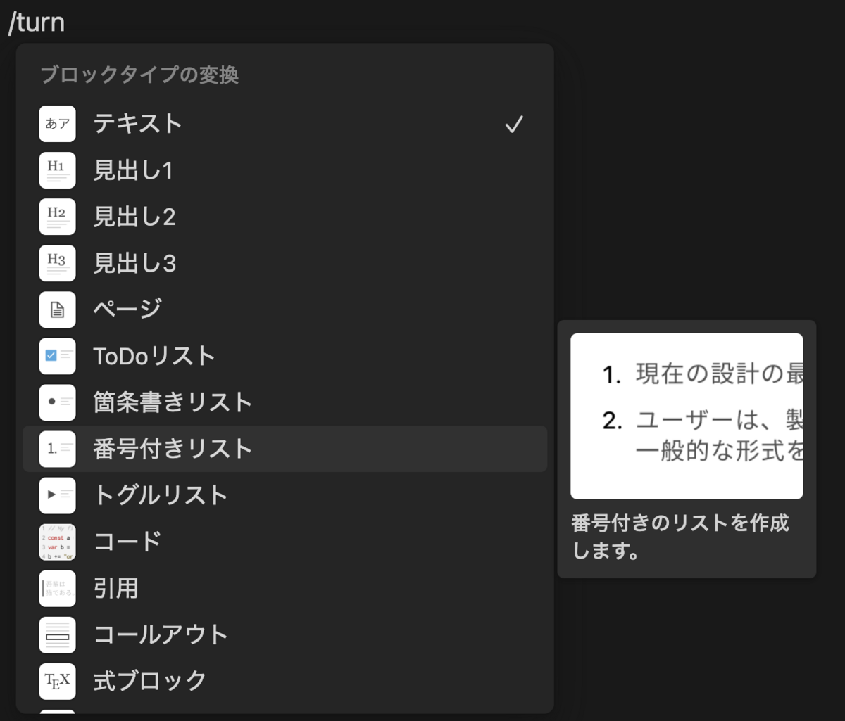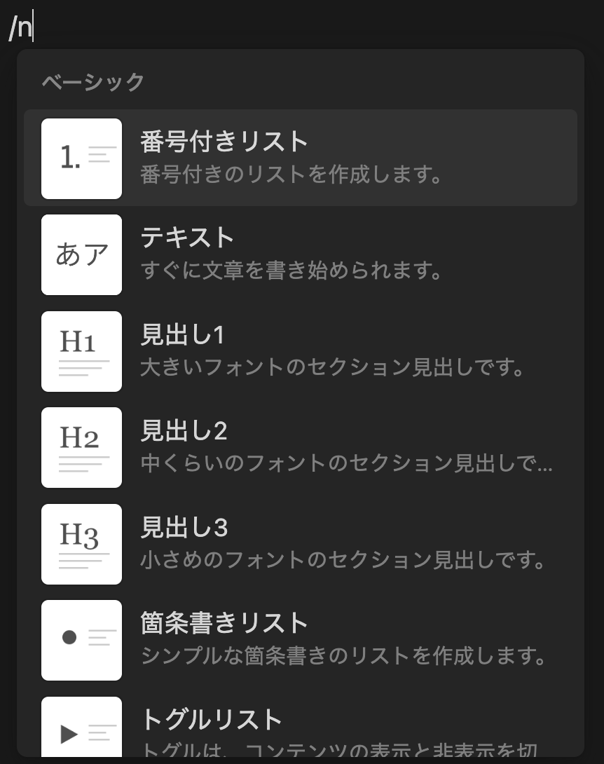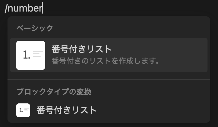 慣れてくるとカーソルで選ぶのが面倒になります。「/number」と書けば番号付きリストが選択されます。