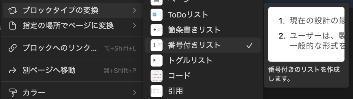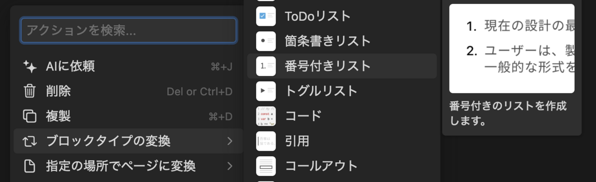 ブロックハンドルをクリックして表示されるメニューから「ブロックタイプの変換」を選び「番号付きリスト」を選択します。