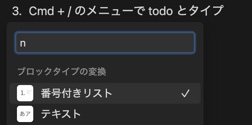 Cmd + / の後に n まで書くだけで番号付きリスト一つになりました。