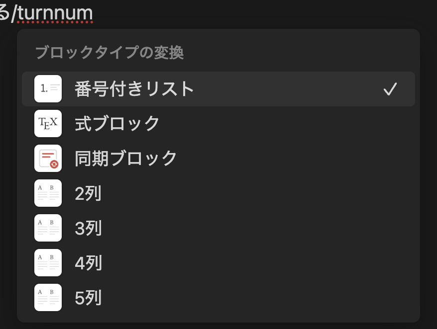 作成の時にも書きましたが、上記のショートカットキーをタイプすると現在のブロックが番号付きリストに変わります。わかっていればこれが一番早いです。