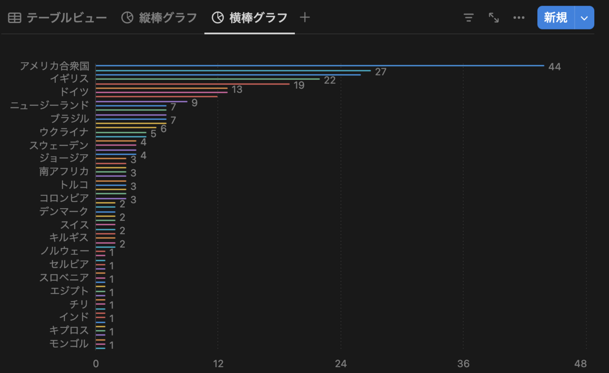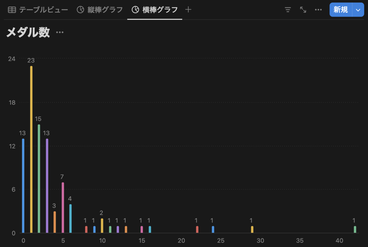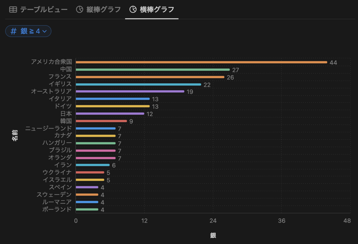 昨日の続きで、横棒チャートビューを追加してみます。元データは昨日解説したこちらのデータを使ってみます。このデータは金・銀・銅の順位で並んでいるため、金のグラフはそのままでした。今日は銀のグラフを個数の降順に横棒グラフで描画してみることにします。