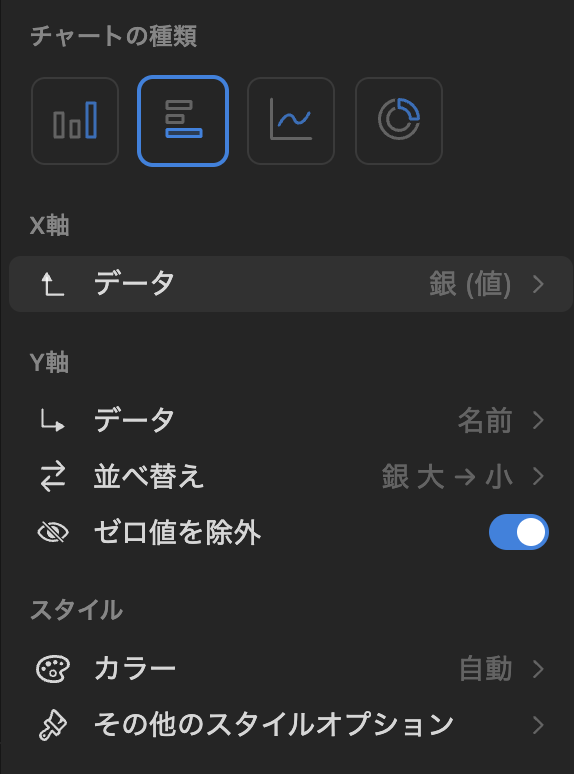 - X軸のデータを「銀」の値に設定