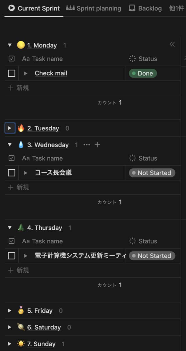 せっかくなので、これをプロジェクト(曜日)ごとにグルーピングしてみます。