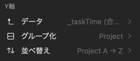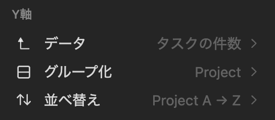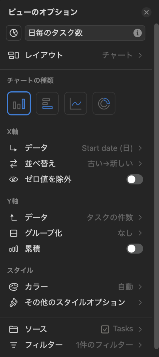 これらのタスクを日毎のタスク件数でグラフを描画してみます。ビューのオプションは以下のようになります。設定したものを箇条書きにしてみます。