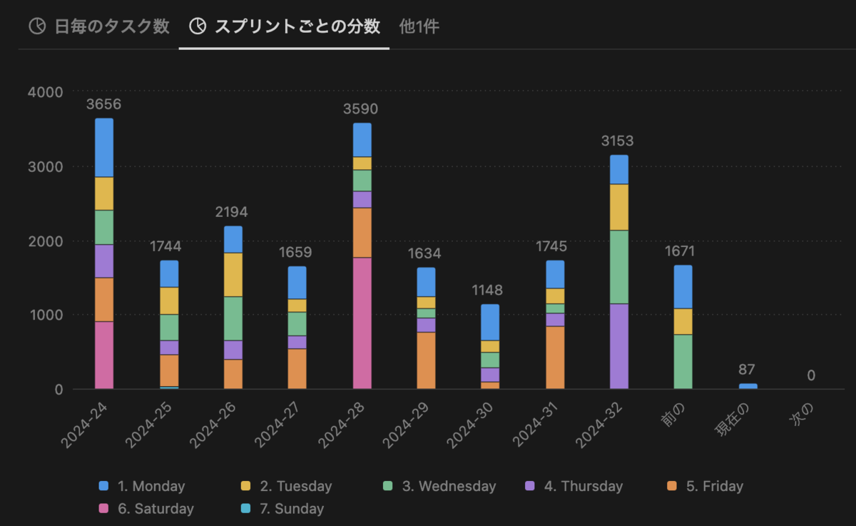 これにより次のようなグラフが描画されました。先週は夏休みを取ったのでタスク0の日が多いですね。こんな形で集計の数式を作成することなく、集計されたグラフが描画されます。