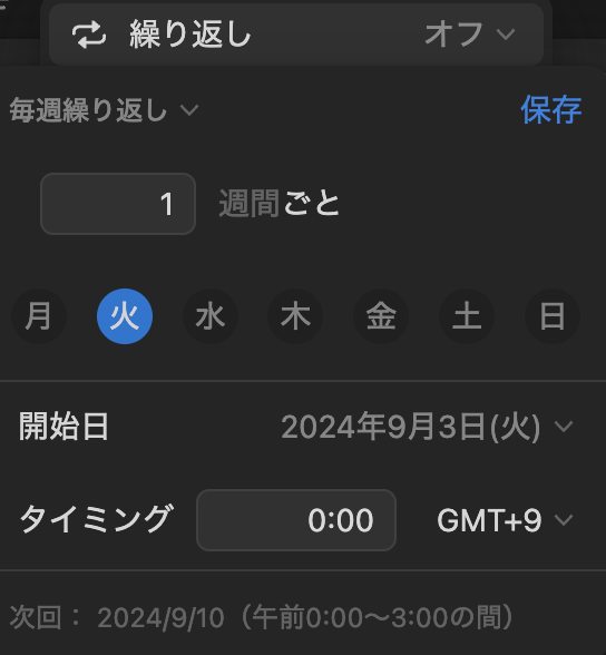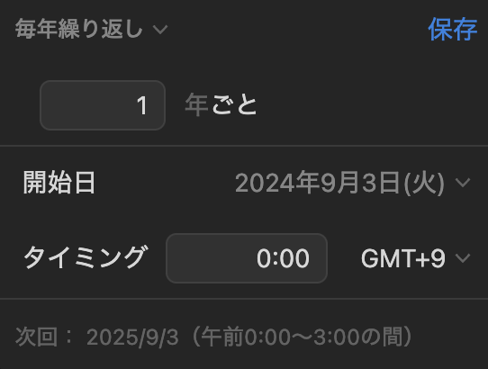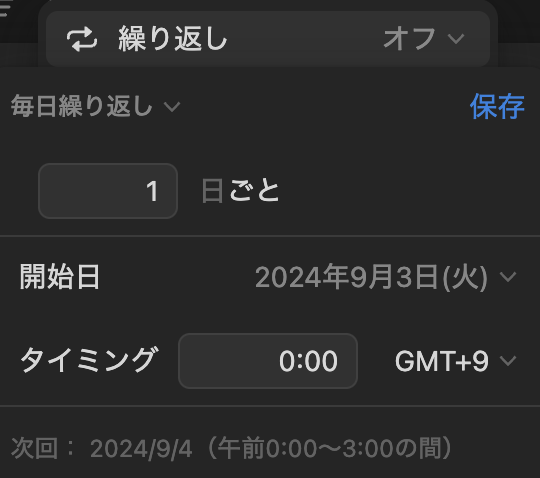 毎日繰り返しのメニューは以下のようになります。毎日という表記ではありますが、数日ごとの繰り返しを設定することもできます。ここでデフォルトはタイミングが日本時間の 0:00 になっていますが、作成時間は変えたほうがよいです。同じタイムゾーンの人がみんなこの時間に作成するとサーバ負荷がかかり、うまく作成されないという事象が発生する可能性があります。