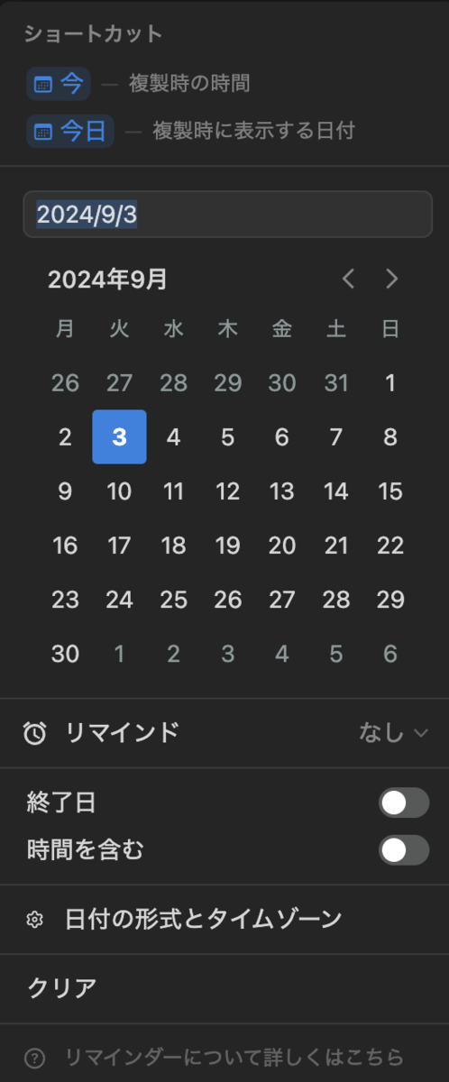 テンプレートのプロパティにはデフォルト値を設定することができます。特に日付プロパティに関しては、具体的な日付だけでなく、上のショートカットのところにあるように「今」と「今日」を設定することが可能です。これはページを作成したタイミングのその日付や時刻が自動的に展開されます。