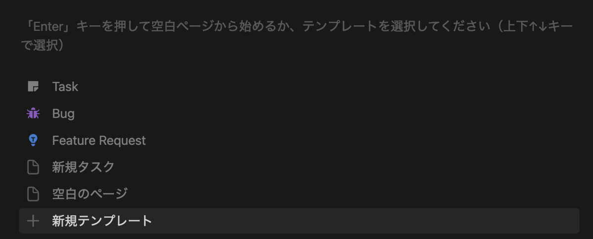 そもそもテンプレートを編集するという作業自体に行くまでも、慣れない人にはハードルが高いですね。どちらかというとテンプレートの作成は、新規ページを作った時に出てくる以下の画面から作成する人がほとんどではないでしょうか。上の手順はそれなりに Notion に使い慣れた人しか使わない気がします。