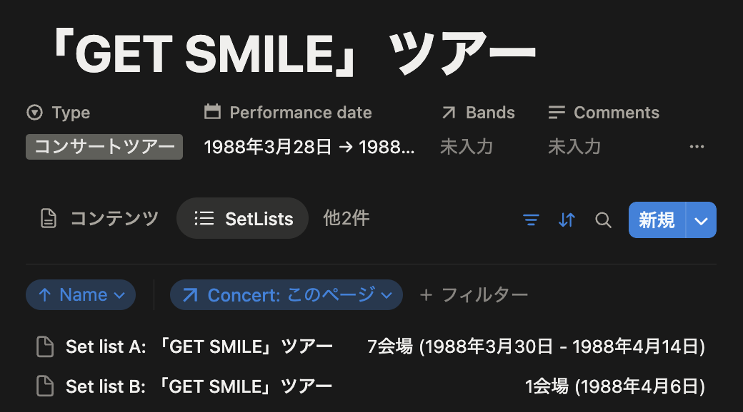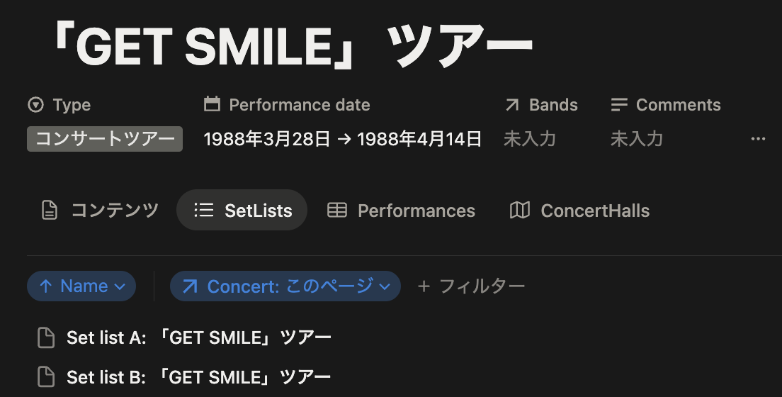 SetList は一覧ページはなく、Concert のタブから参照されます。このページにもう少し情報が欲しいですね。