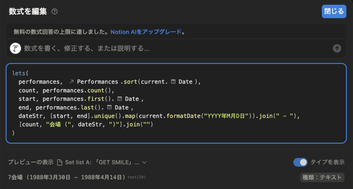 lets( performances, prop("Performances").sort(current.prop("Date")), count, performances.count(), start, performances.first().prop("Date"), end, performances.last().prop("Date"), dateStr, [start, end].unique().map(current.formatDate("YYYY年M月D日")).join(" - "), [count, "会場 (", dateStr, ")"].join("") )