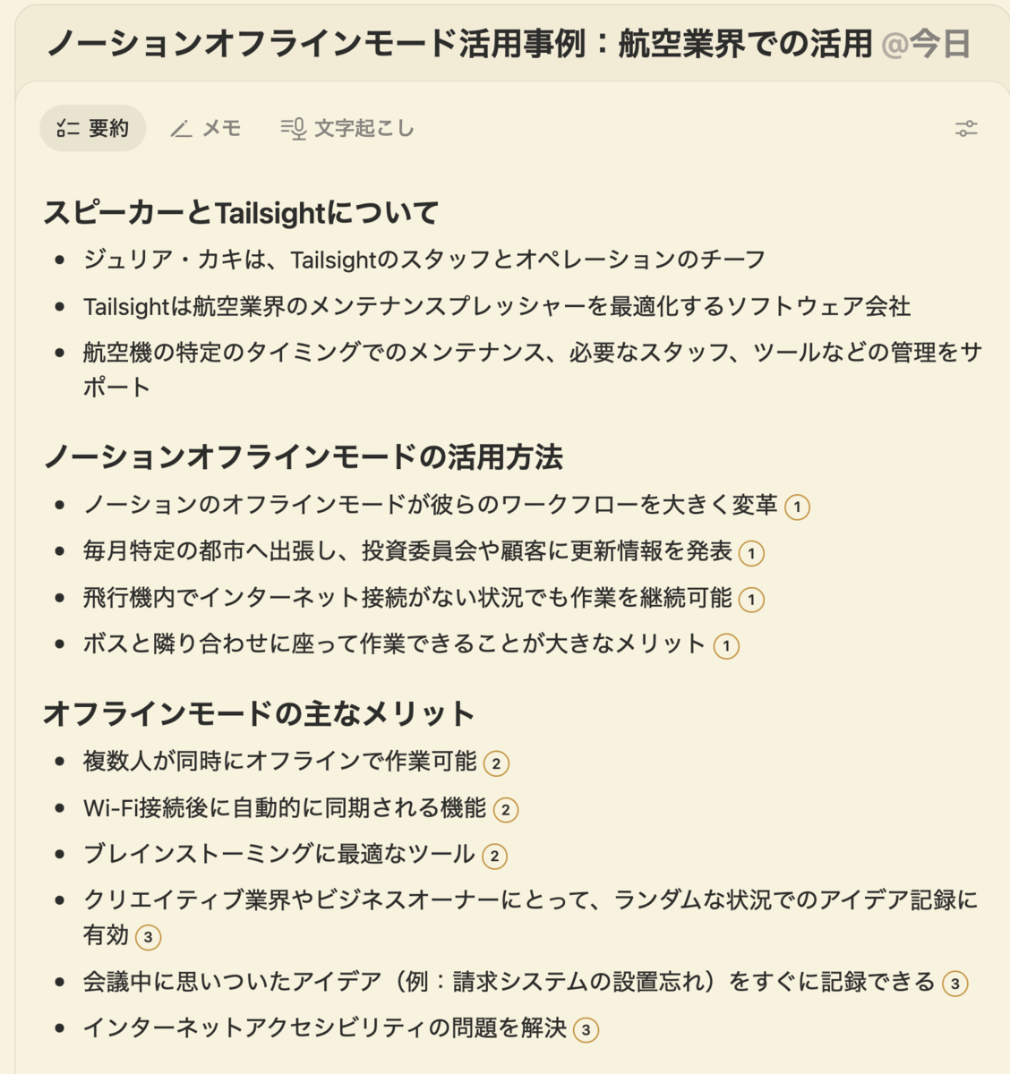 こんな感じでようやくされました。英語を読み込ませても日本語で文字起こしされ、日本語で要約されるのは便利ですね。箇条書きの丸数字の部分が文字起こしへのリンクになっています。