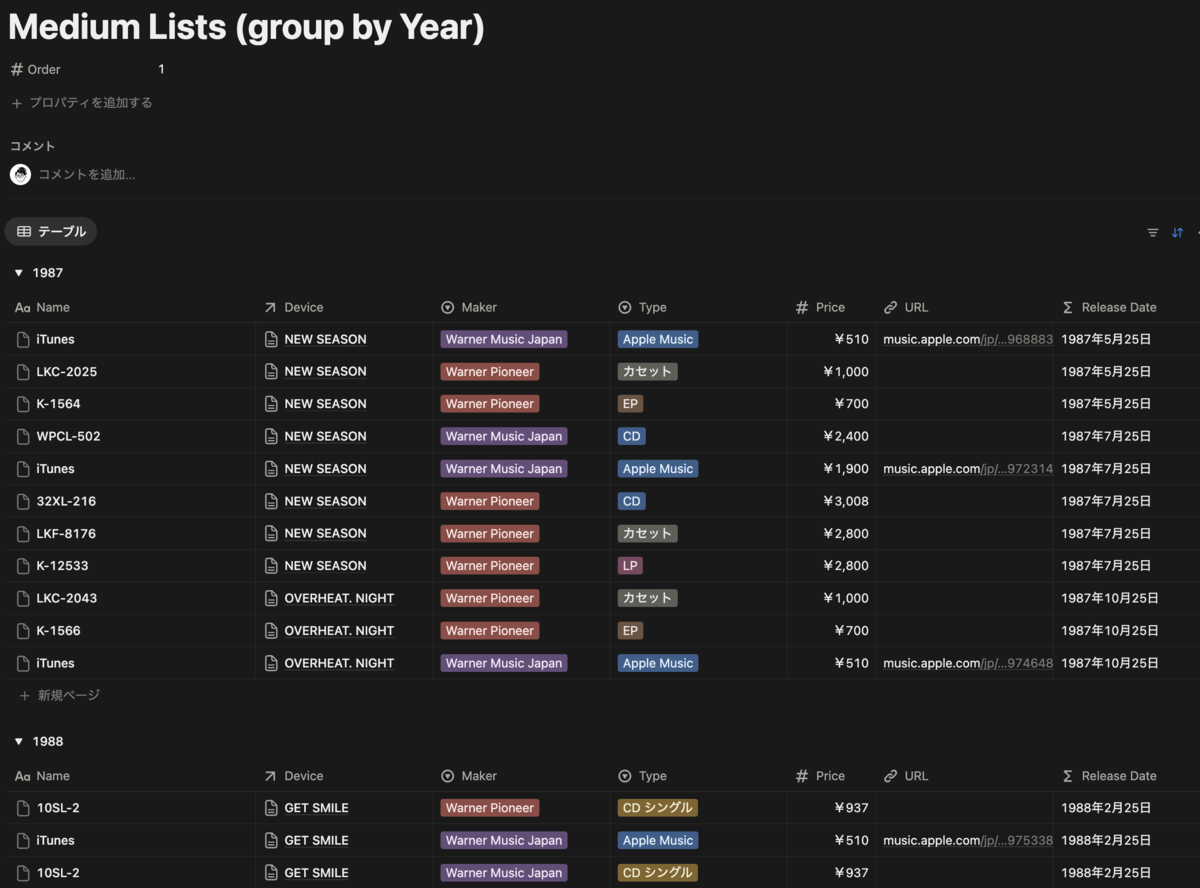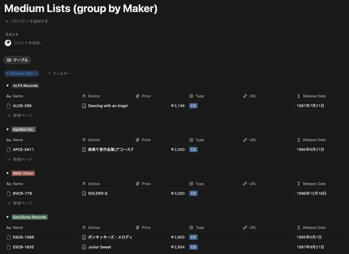 この Release Date で並び替えを行い、Maker でグルーピングを用いて一覧を作成しました。