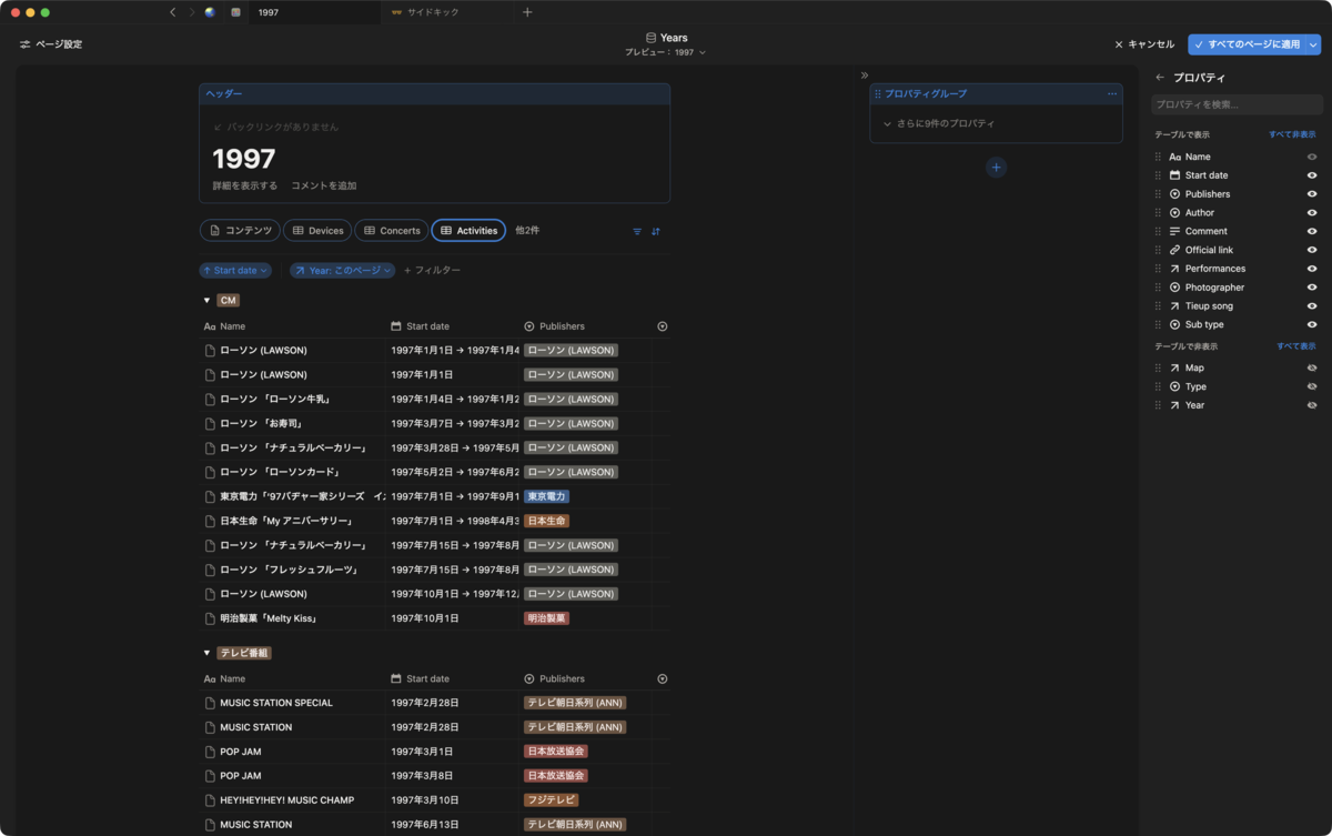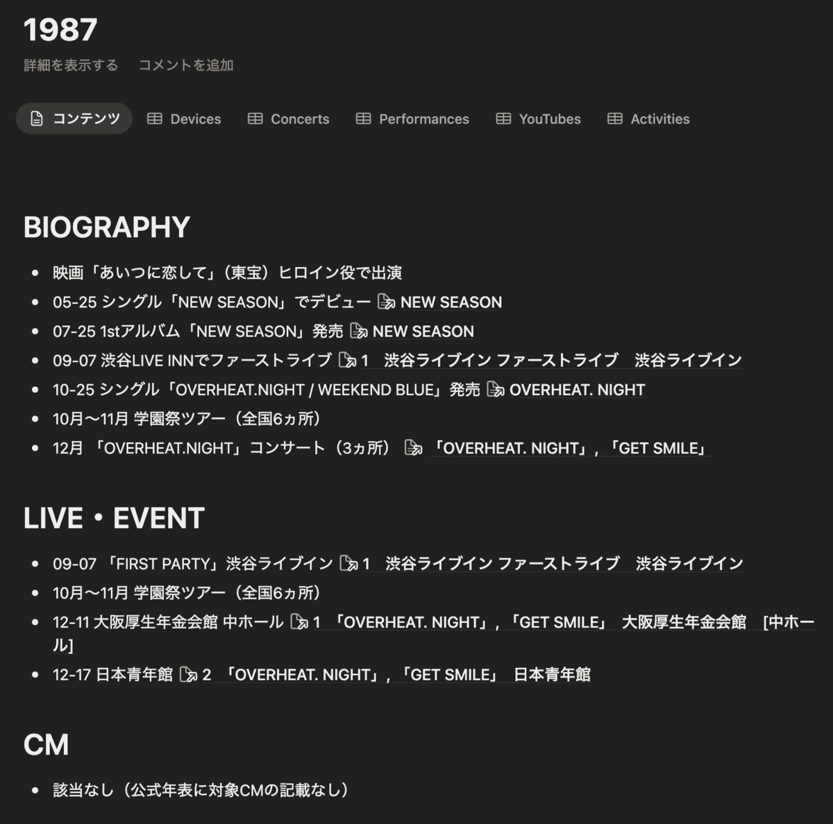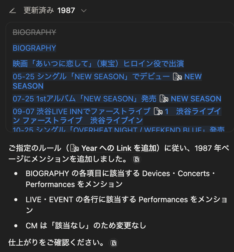 1987年のコンテンツについて、指示書に従ってリレーションが貼られたページへのメンションが追加されました。今後、他の年についてもメンションを追加していきます。最近の情報は登録されていないため、メンションが貼られなかった行に対して、情報を追加していけばよさそうです。