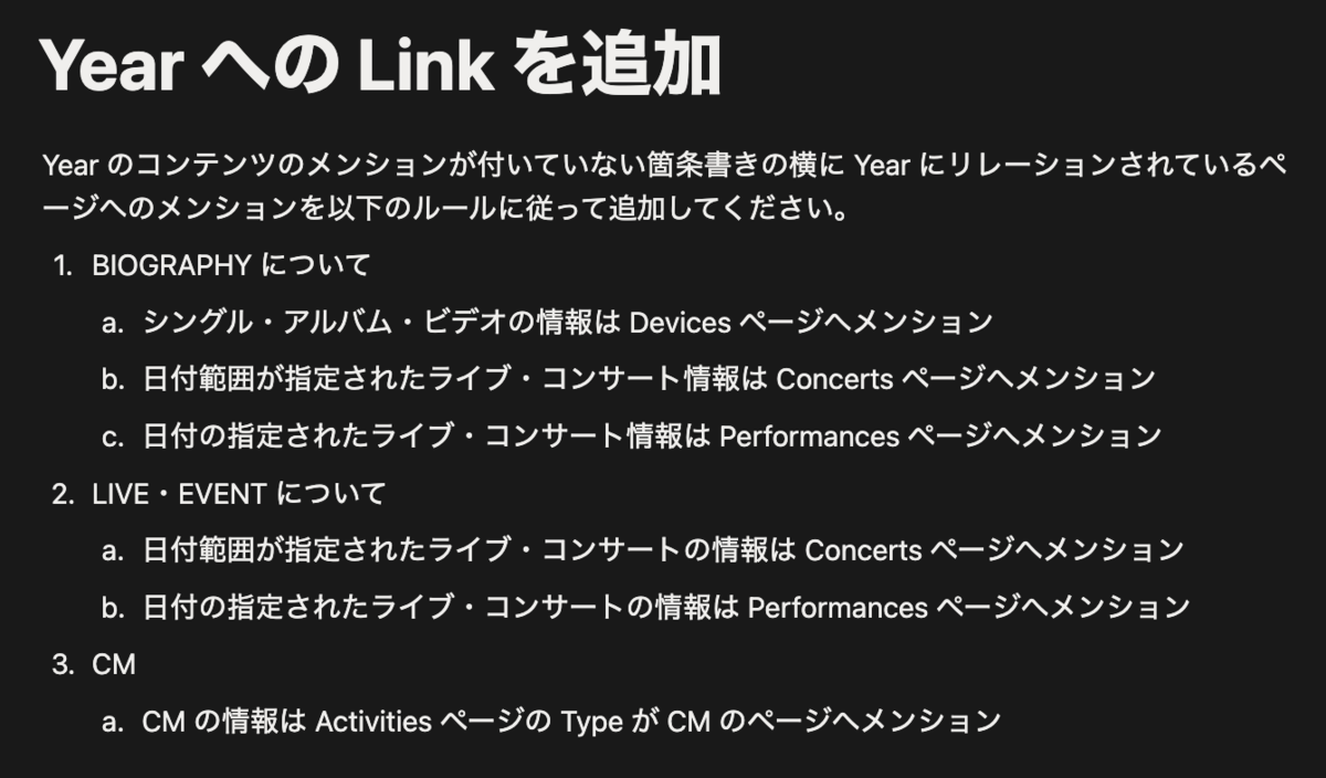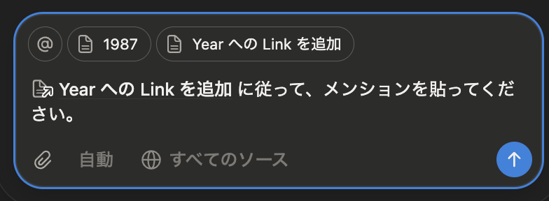 次に一昨日作成した Year のコンテンツに、Year にリレーションされたページのメンションを追加してみようと思います。毎回指示を書くのは面倒なので、ページにまとめてみました。