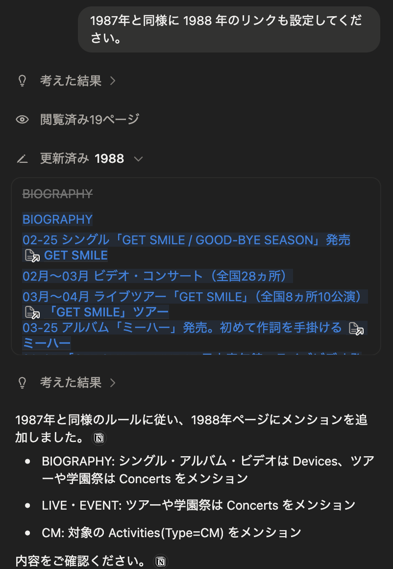 同じチャットの続きとして、「1987年と同様に 1988 年のリンクも設定してください。」とだけしてみました。