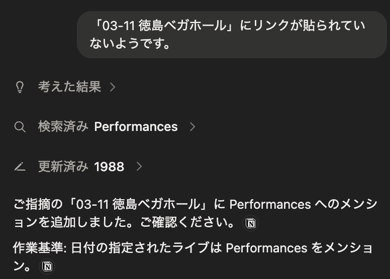 いい感じで設定されたようですが、Performances へのリンクが設定されていませんでした。