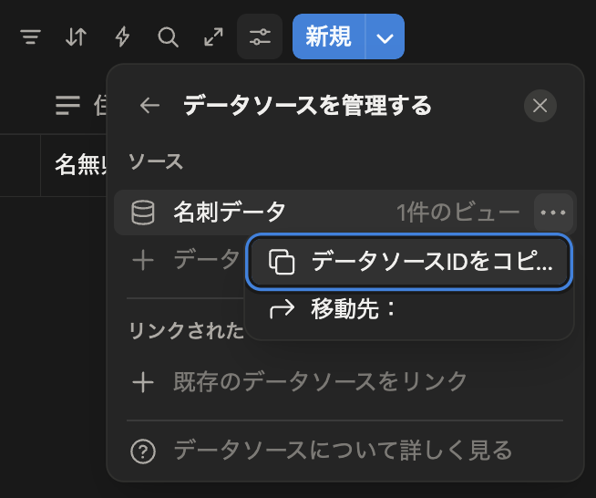 まず、動作確認のために NotionRubyMapping でページが作成できることを確認します。まずはデータソースIDを取得します。データソースの管理の場所から「データソースIDをコピー」を選択します。