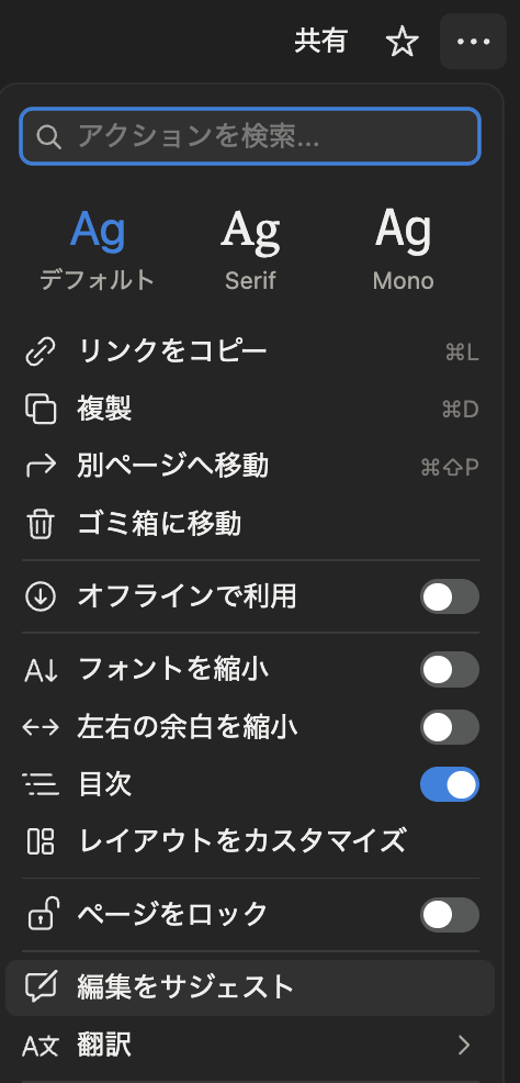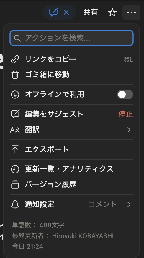 今回、配布するテンプレートのアップデートをする予定でしたが、本文についても同時に修正し、まとまったところで改訂版として出版することも検討しています。編集者の人に変更点を知らせるために、サジェストモードで編集する予定です。サジェストモードは右上の … から「編集をサジェスト」とします。