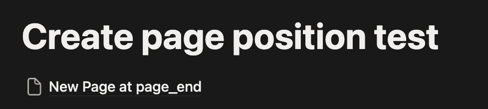 curl 'https://api.notion.com/v1/pages' \ -H 'Authorization: Bearer '"$NOTION_API_KEY"'' \ -H "Content-Type: application/json" \ -H "Notion-Version: 2025-09-03" \ --data '{ "parent": { "type": "page_id", "page_id": "2f0d8e4e98ab8065b3a2ec9fd4b3e57a" }, "properties": { "title": { "type": "title", "title": [ { "type": "text", "text": { "content": "New Page at page_end", "link": null }, "plain_text": "New Page at page_end", "href": null } ] } }, "position": { "type": "page_end" } }'