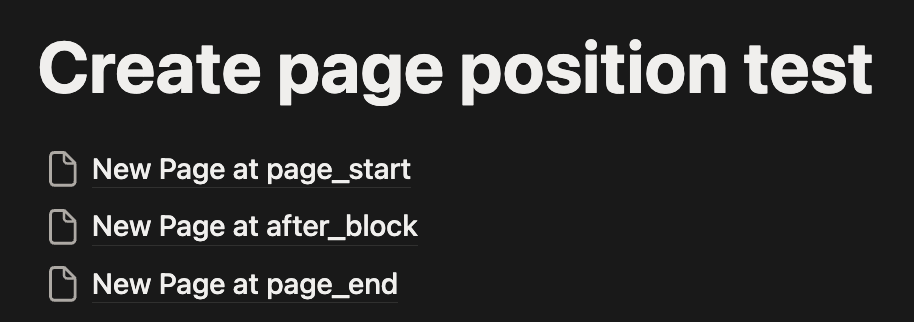 curl 'https://api.notion.com/v1/pages' \ -H 'Authorization: Bearer '"$NOTION_API_KEY"'' \ -H "Content-Type: application/json" \ -H "Notion-Version: 2025-09-03" \ --data '{ "parent": { "type": "page_id", "page_id": "2f0d8e4e98ab8065b3a2ec9fd4b3e57a" }, "properties": { "title": { "type": "title", "title": [ { "type": "text", "text": { "content": "New Page at after_block", "link": null }, "plain_text": "New Page at after_block", "href": null } ] } }, "position": { "type": "after_block", "after_block": { "id": "2f0d8e4e-98ab-812c-a8f5-cce62b2d3f6e" } } }'